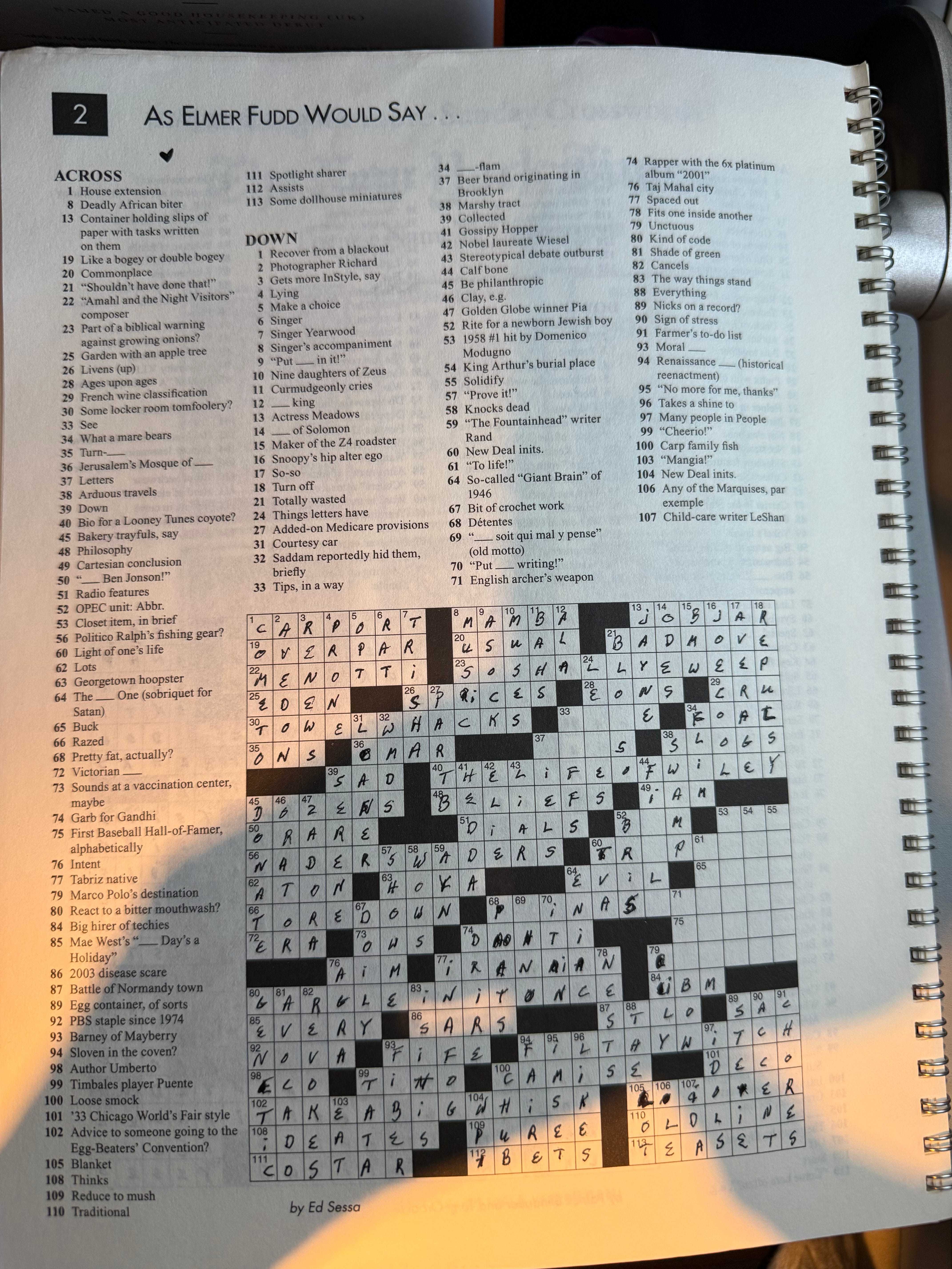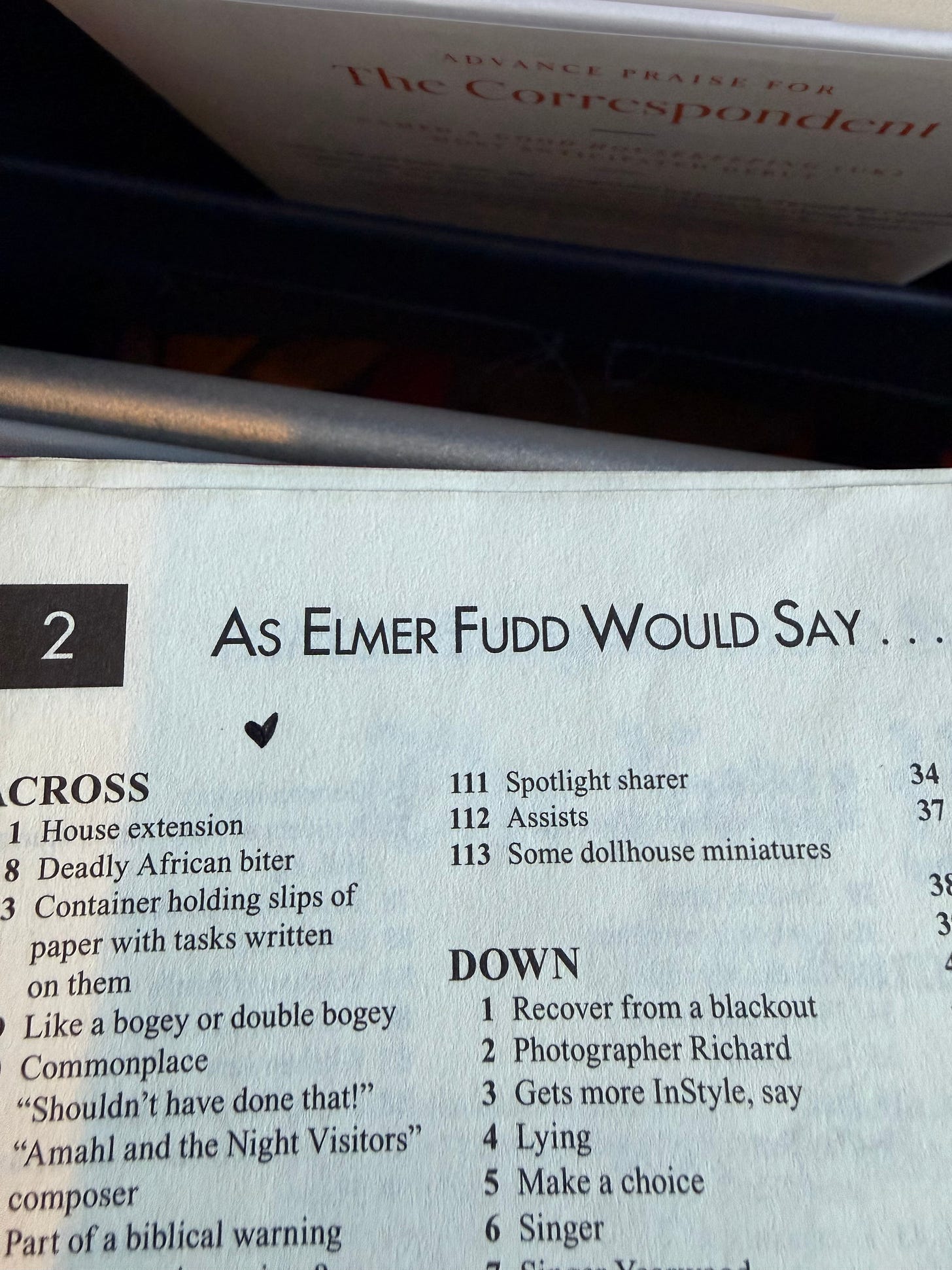 Most importantly, my mom died. And puzzling now seems fraught with unattended-to grief. I’m scared of them and scared of what I might feel. Last week I was on a flight, and I found an old NYT Sunday puzzle book that belonged to my mom in my bag, a bag I hadn’t used since before my mom died. I pulled it out and saw that she had started but not finished one of the puzzles (surely for time reasons and not skill!)